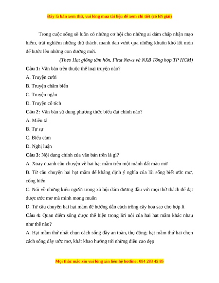 Câu 6: Biện pháp tu từ nào được sử dụng trong lời nói của hạt mầm thứ nhất? A. So sánh B. Nhân hóa C. Điệp ngữ D. Nói quá
