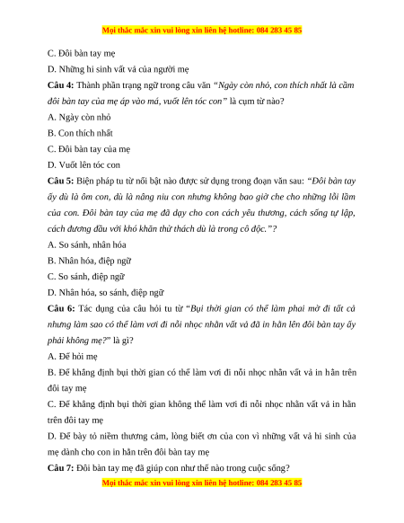 Câu 5: Biện pháp tu từ nổi bật nào được sử dụng trong đoạn văn sau: “Đôi bàn tay