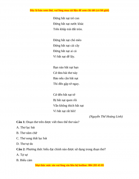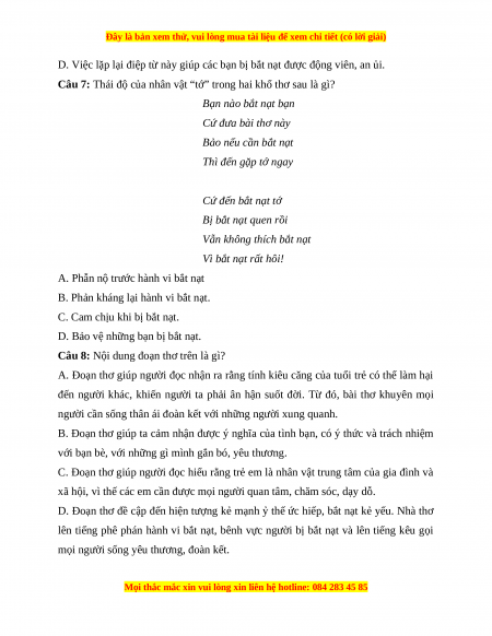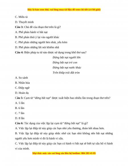 Câu 5: Cụm từ “đừng bắt nạt” được xuất hiện bao nhiêu lần trong đoạn thơ trên? A. 5 lần B. 6 lần C. 7 lần D. 8 lần