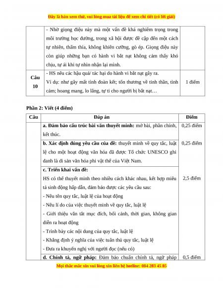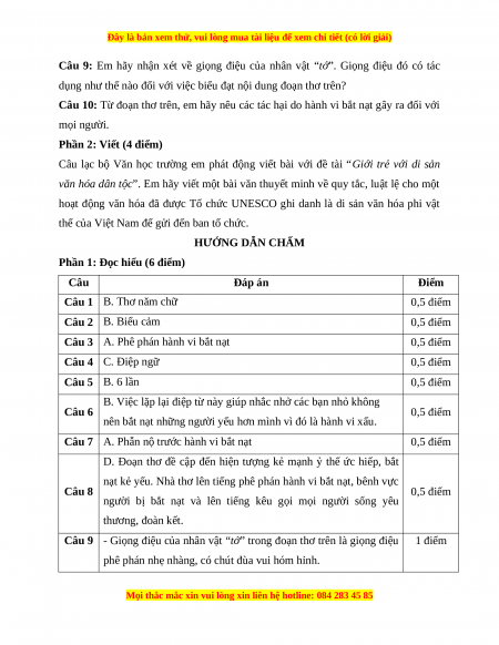 Câu 3 A. Phê phán hành vi bắt nạt 0,5 điểm Câu 4 C. Điệp ngữ 0,5 điểm Câu 5 B. 6 lần 0,5 điểm