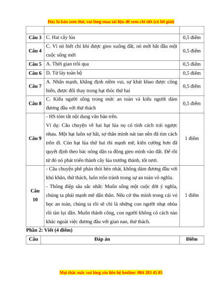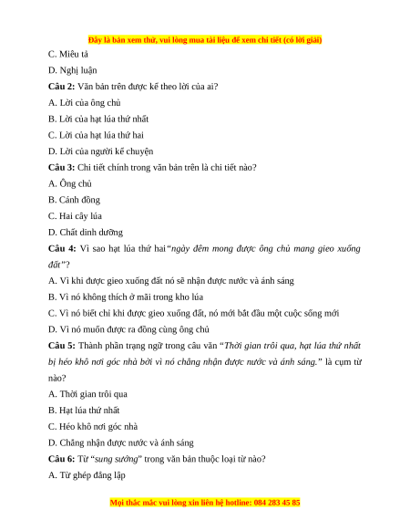 Câu 3: Chi tiết chính trong văn bản trên là chi tiết nào? A. Ông chủ B. Cánh đồng C. Hai cây lúa D. Chất dinh dưỡng