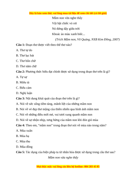 Câu 8: Ý nghĩa của đoạn thơ trên là gì? A. Miêu tả mầm non