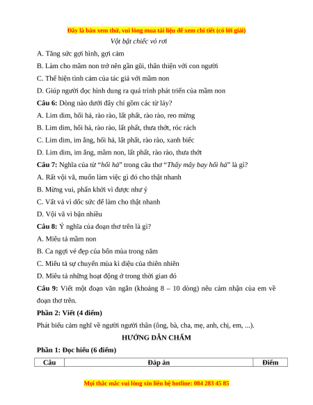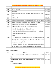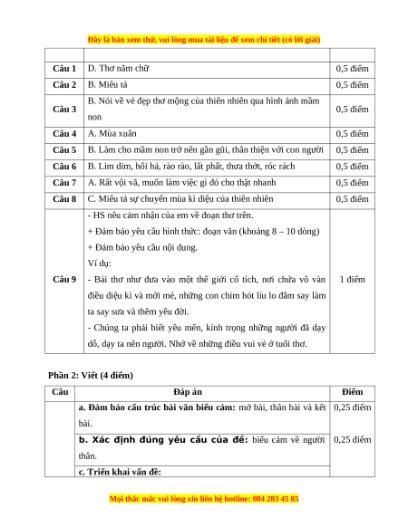 B. Nói về vẻ đẹp thơ mộng của thiên nhiên qua hình ảnh mầm Câu 3 0,5 điểm non Câu 4 A. Mùa xuân 0,5 điểm Câu 5