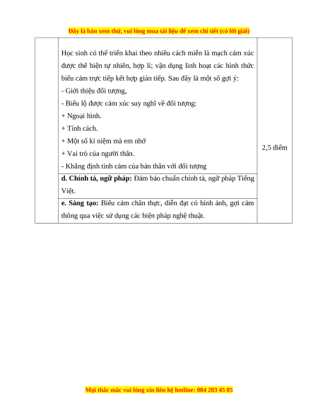 b. Xác định đúng yêu cầu của đề: biểu cảm về người 0,25 điểm thân.