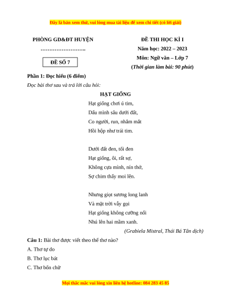 - Tailieugiaovien.com.vn giới thiệu bộ 10 đề cuối học kì 1 môn Ngữ Văn 7 bộ Kết nối tri thức mới nhất nhằm giúp Giáo viên có thêm tài liệu tham khảo ra đề thi Ngữ Văn lớp 7.