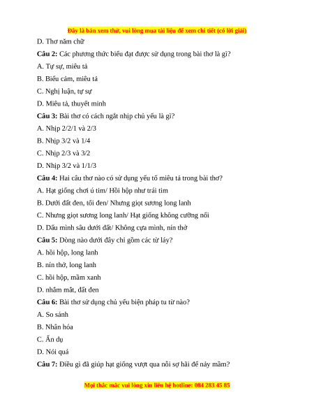 Câu 3: Bài thơ có cách ngắt nhịp chủ yếu là gì? A. Nhịp 2/2/1 và 2/3 B. Nhịp 3/2 và 1/4 C. Nhịp 2/3 và 3/2 D. Nhịp 3/2 và 1/1/3
