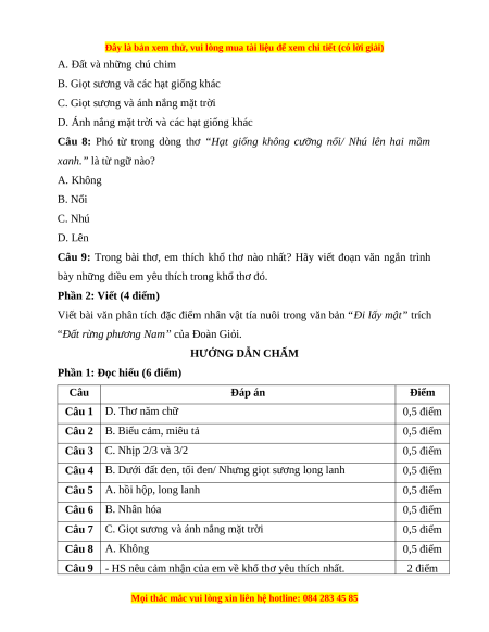 Câu 7 C. Giọt sương và ánh nắng mặt trời 0,5 điểm Câu 8 A. Không 0,5 điểm