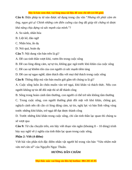 vừa mở cửa sổ” của Nguyễn Ngọc Thuần. HƯỚNG DẪN CHẤM
