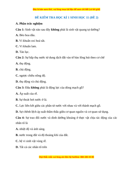 ĐỀ KIỂM TRA HỌC KÌ 1 SINH HỌC 11 (ĐỀ 2)