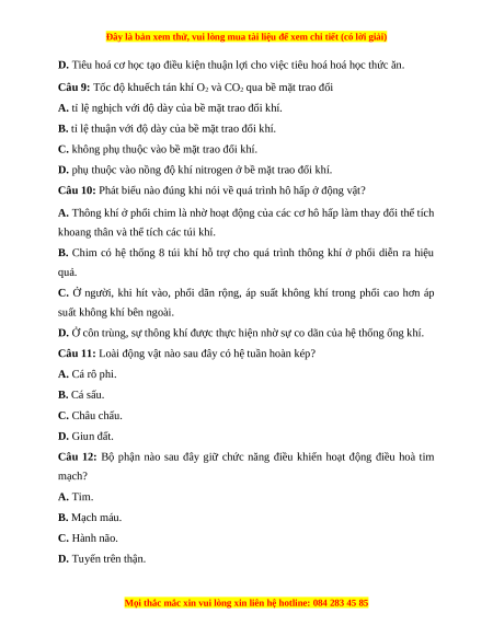 Câu 10: Phát biểu nào đúng khi nói về quá trình hô hấp ở động vật?