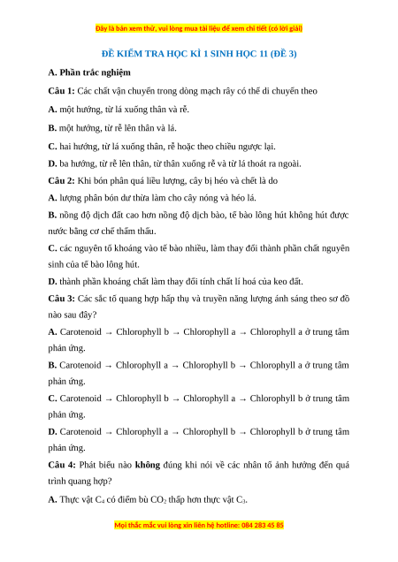 ĐỀ KIỂM TRA HỌC KÌ 1 SINH HỌC 11 (ĐỀ 3)