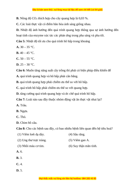 Câu 8: Cho các bệnh sau đây, có bao nhiêu bệnh liên quan đến hệ tiêu hoá? (1) Viêm loét dạ dày. (4) Sâu răng. (2) Ung thư trực tràng. (5) Viêm gan A. (3) Nhồi máu cơ tim. (6) Suy thận mãn tính. A. 6. B. 3. C. 4. D. 5.