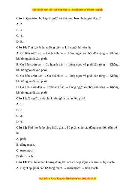 Câu 9: Quá trình hô hấp ở người và thú gồm bao nhiêu giai đoạn? A. 2. B. 3. C. 4. D. 5.