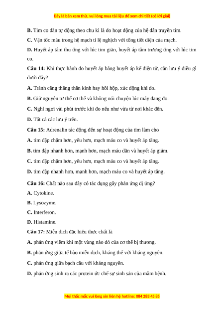 Câu 16: Chất nào sau đây có tác dụng gây phản ứng dị ứng? A. Cytokine. B. Lysozyme. C. Interferon. D. Histamine.