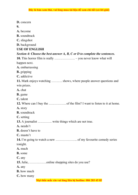 D. concern 9. A. become B. soundtrack C. slingshot D. background USE OF ENGLISH
