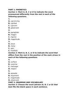pronounced differently from the rest in each of the following questions. 1. A. convincing B. combat C. concern D. observant 2. A. paraglider B. impact C. marine D. magnitude 3. A. issue B. misty C. spin C. frostbite