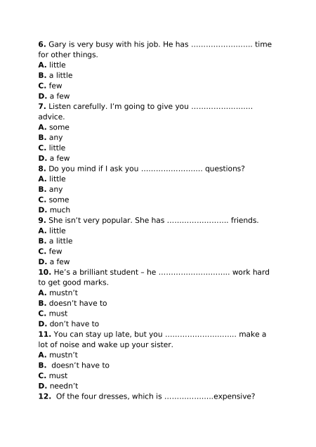 6. Gary is very busy with his job. He has ……………………. time for other things. A. little B. a little C. few D. a few