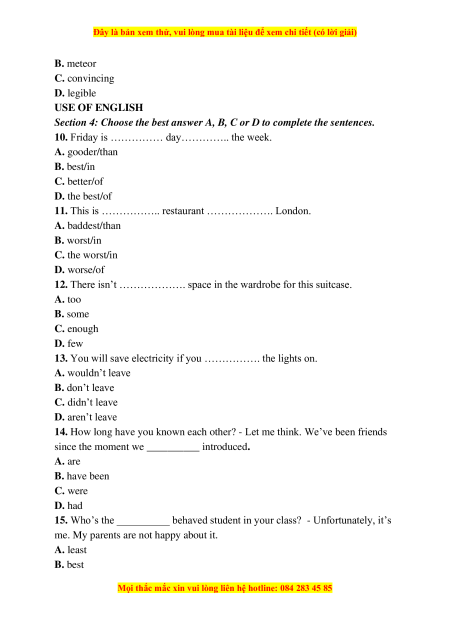 Section 4: Choose the best answer A, B, C or D to complete the sentences.