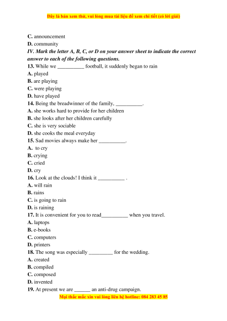 13. While we __________ football, it suddenly began to rain A. played B. are playing C. were playing D. have played