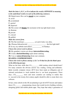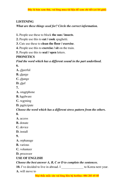 Choose the word which has a different stress pattern from the others. 8. A. access B. donate C. device D. install 9. A. orphanage B. various C. volunteer D. processor USE OF ENGLISH