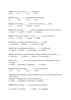Câu 16: The books he wrote about famous mountain climbers are his greatest ______. A. achievable B. achieve C. achiever D. achievements