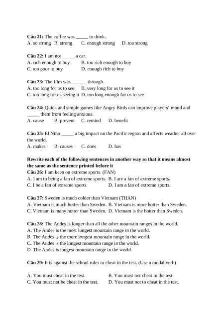 Câu 21: The coffee was _____ to drink. A. so strong B. strong C. enough strong D. too strong