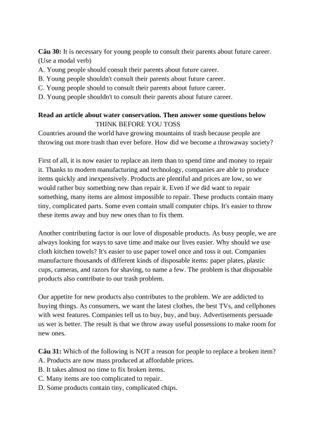 Câu 30: It is necessary for young people to consult their parents about future career.