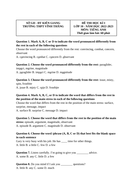 LỚP 10 - NĂM HỌC 2022-2023 MÔN: TIẾNG ANH