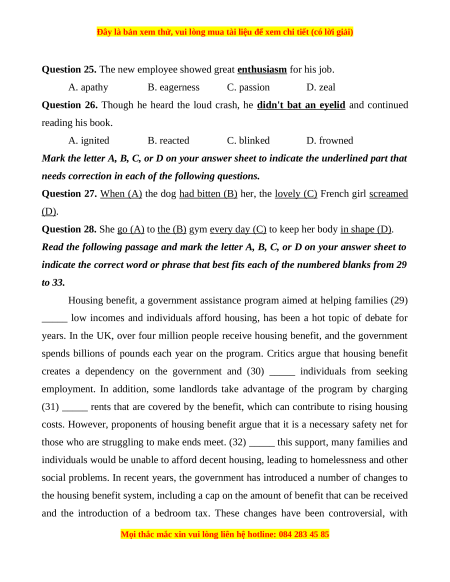 Question 25. The new employee showed great enthusiasm for his job. A. apathy B. eagerness C. passion D. zeal