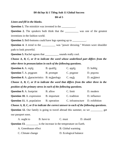- Tailieugiaovien.com.vn giới thiệu bộ đề thi cuối kì 1 kèm file nghe môn Tiếng anh 11 Global successmới nhất năm 2023 nhằm giúp Giáo viên có thêm tài liệu tham khảo ra đề thi Tiếng anh lớp 11.