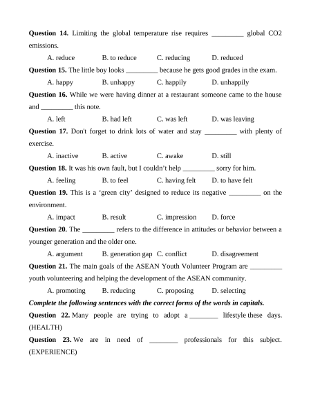 Question 14. Limiting the global temperature rise requires _________ global CO2 emissions. A. reduce B. to reduce C. reducing D. reduced