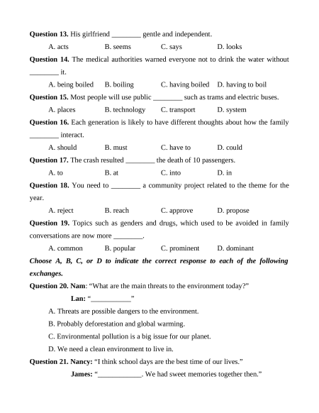 Question 13. His girlfriend ________ gentle and independent. A. acts B. seems C. says D. looks