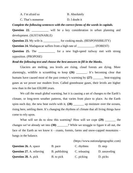 (https://www.nationalgeographic.com) Question 26. A. space B. pace C. rhythms D. step