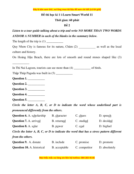Đề thi cuối kì 1 Tiếng Anh 11 ilearn smart world (Đề 2 kèm file nghe)