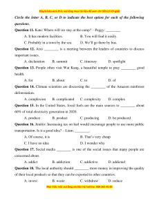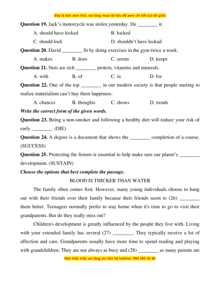 Question 20. David ________ fit by doing exercises in the gym twice a week. A. makes B. does C. seems D. keeps
