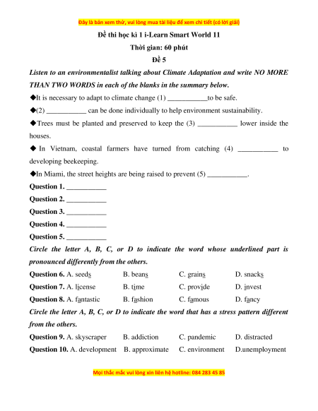 Đề thi cuối kì 1 Tiếng Anh 11 ilearn smart world (Đề 5 kèm file nghe)