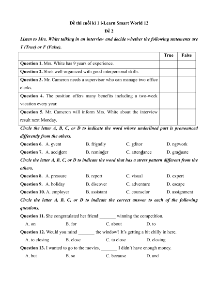 Đề thi Cuối kì 1 Tiếng Anh 12 Ilearn Smart world (Đề 2 kèm file nghe)