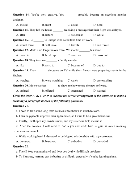 Question 14. You’re very creative. You _______ probably become an excellent interior designer. A. should B. must C. could D. need