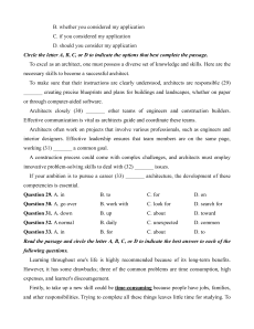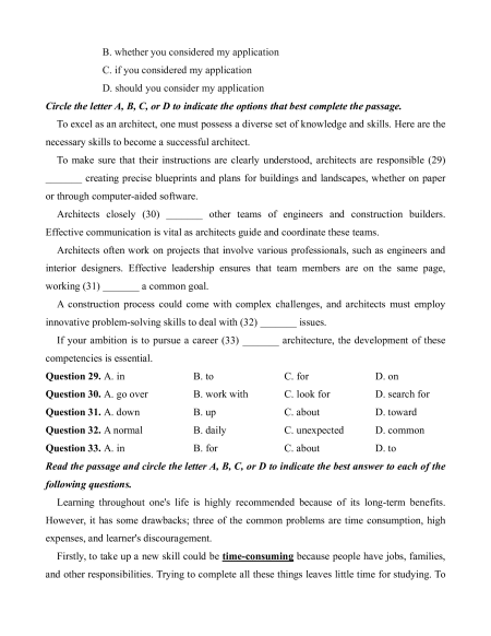 If your ambition is to pursue a career (33) _______ architecture, the development of these competencies is essential. Question 29. A. in B. to C. for D. on Question 30. A. go over B. work with C. look for D. search for Question 31. A. down B. up C. about D. toward Question 32. A normal B. daily C. unexpected D. common Question 33. A. in B. for C. about D. to
