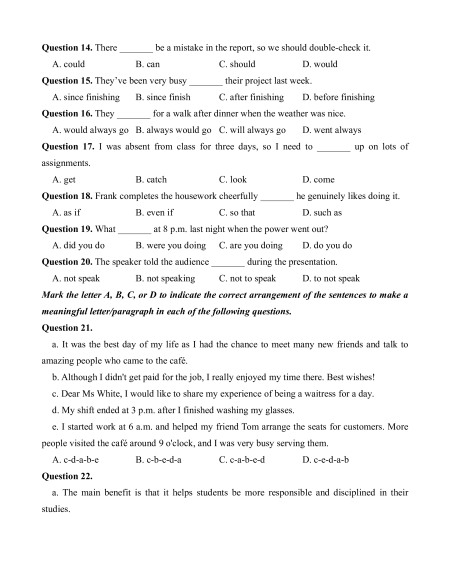 Question 14. There _______ be a mistake in the report, so we should double-check it. A. could B. can C. should D. would