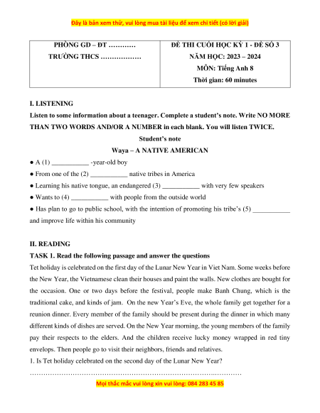 Đề thi cuối kì 1 Tiếng Anh 8 Global success (Đề 3 kèm file nghe)