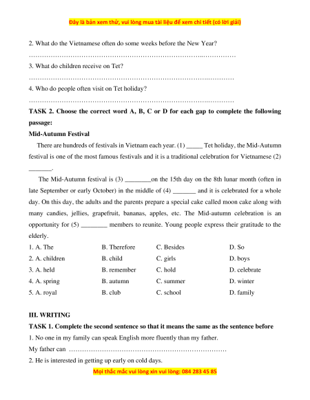 opportunity for (5) ________ members to reunite. Young people express their gratitude to the elderly. 1. A. The B. Therefore C. Besides D. So 2. A. children B. child C. girls D. boys 3. A. held B. remember C. hold D. celebrate 4. A. spring B. autumn C. summer D. winter 5. A. royal B. club C. school D. family III. WRITING