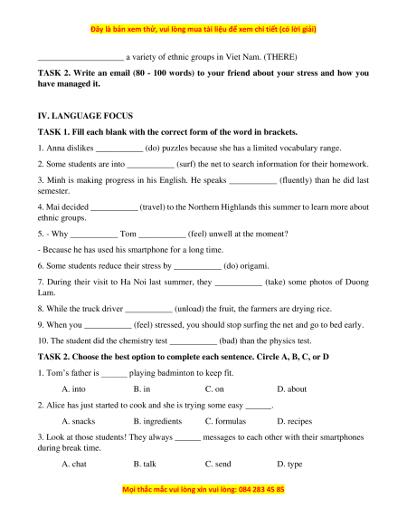 TASK 2. Write an email (80 - 100 words) to your friend about your stress and how you have managed it. IV. LANGUAGE FOCUS