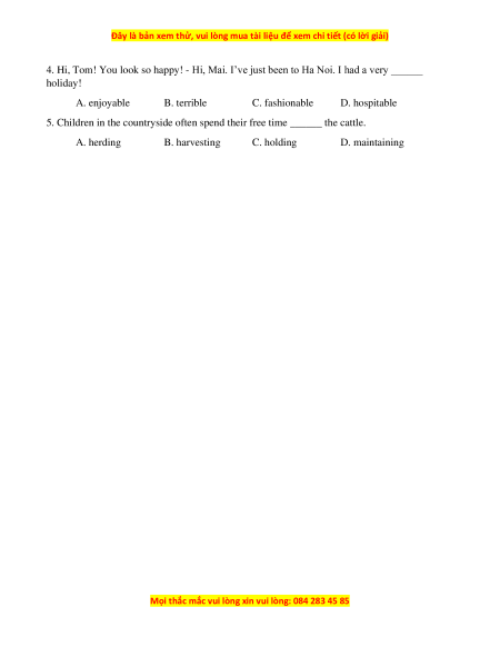 4. Hi, Tom! You look so happy! - Hi, Mai. I’ve just been to Ha Noi. I had a very ______