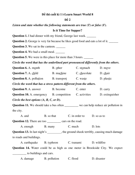Đề thi cuối kì 1 Tiếng Anh 8 ilearn smart world (Đề 2 kèm file nghe)