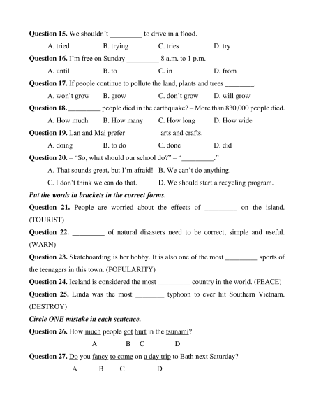 Question 15. We shouldn’t _________ to drive in a flood. A. tried B. trying C. tries D. try