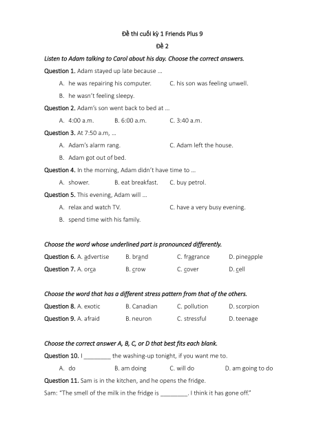 Đề thi cuối kỳ 1 Friends Plus 9 Đề 2
