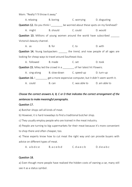 Question 12. Do you think I ________ be worried about these spots on my forehead? A. might B. should C. could D. would
