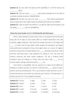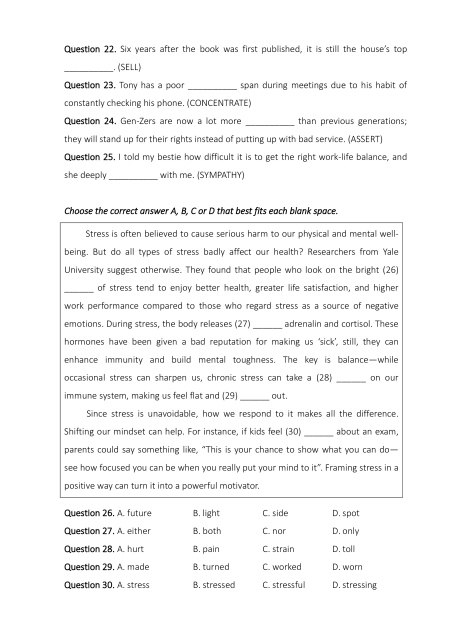 positive way can turn it into a powerful motivator. Question 26. A. future B. light C. side D. spot Question 27. A. either B. both C. nor D. only Question 28. A. hurt B. pain C. strain D. tol Question 29. A. made B. turned C. worked D. worn Question 30. A. stress B. stressed C. stressful D. stressing