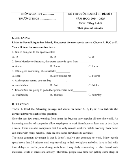 NĂM HỌC: 2024 – 2025 MÔN: Tiếng Anh 9 Thời gian: 60 minutes I. LISTENING